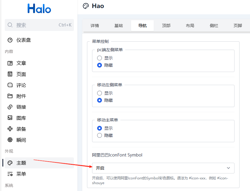 接着把主题设置-导航-阿里巴巴iconFont Symbol打开